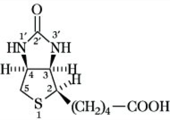 Biotin, Vitamin H, ein stickstoff- und schwefelhaltiges, wasserlösliches Vitamin. B. bildet nadelförmige Kristalle; F. 232 bis 233 °C, [α]D21 +91° (0,1 N NaOH). Es ist in organischen Lösungsmitteln praktisch unlöslich. B. ist in geringen Mengen in allen Zellen enthalten. Zu den biotinreichsten Quellen gehört die Leber, die etwa 0,00025 % enthält. Die Bestimmung des B. erfolgt aufgrund der sehr geringen Konzentration in biologischen Materialien mikrobiologisch. B. ist für Mikroorganismen ein Wuchsstoff. Biotinmangel erzeugt beim Menschen Hautveränderungen, die sich insbesondere in einer vermehrten Talgproduktion äußern. Ein solcher Mangel kann durch reichliche Aufnahme von rohen Eiern zustande kommen. Im Eiweiß ist das Protein Avidin enthalten, das B. spezifisch bindet. B. wirkt als Coenzym von Enzymen, die Kohlendioxid übertragen. Zu den biotinabhängigen Enzymen gehören Kohlendioxidligasen und Carboxyltransferasen. B. ist mit seiner Carboxygruppe amidartig an die ε-Aminogruppe eines Lysinrestes des Apoenzyms gebunden. Das ε-N-Biotinyllysin wird als Biocytin bezeichnet. Kohlendioxid ist am N-Atom 1 des B. als Carboxybiotin, das als "aktives CO2" bezeichnet wird, gebunden.