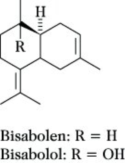 Bisabolen, ein in Pflanzen weit verbreitetes monocyclisches Sesquiterpenderivat, das u. a. im Bergamottöl und im Myrrhenharz (Gummiharze) enthalten ist. B. kann zum Alkohol Bisabolol oxidiert werden, der bis zu 20 % im ätherischen Öl der Kamille (Matricaria chamomilla) vorkommt.
