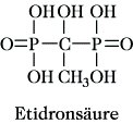 Bisphosphonate, Verbindungen, die eine P-C-P-Bindung enthalten. B. werden chemisch und enzymatisch nicht hydrolysiert. B. hemmen die Aktivität der für den Knochenabbau verantwortlichen Osteoklasten und werden gegen Osteoporose eingesetzt. Ein Beispiel ist Etidronsäure.