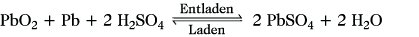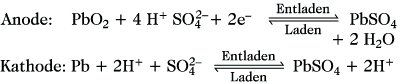 Bleiakkumulator, eine elektrochemische Stromquelle aus der Gruppe der Sekundärzellen. Im geladenen Zustand besteht der positive Pol des B. aus Bleidioxid, der negative Pol aus Blei. Als Elektrolyt wird wäßrige Schwefelsäure verwendet. Die Elektrodenreaktionen lassen sich wie folgt beschreiben: