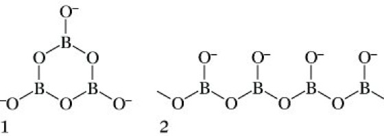 Borate, 1) die Salze der Borsäuren. Den B. liegen Anionen sehr unterschiedlicher Strukturtypen zugrunde. Salze der monomeren Orthoborsäure mit dem planaren BO33--Anion sind selten (z. B. Scandiumorthoborat ScBO3). Sehr viel häufiger sind Metaborate der Zusammensetzung [MIBO3]n die sich von cyclischen oder kettenförmigen polymeren Borsäuren ableiten. Wasserfreiem Natriummetaborat Na3B3O6 liegt z. B. eine cyclisch-trimere Borsäure zugrunde (1), während Calciummetaborat Ca(BO2)2 ein kettenförmiges Polyborat-Anion aufweist (2).