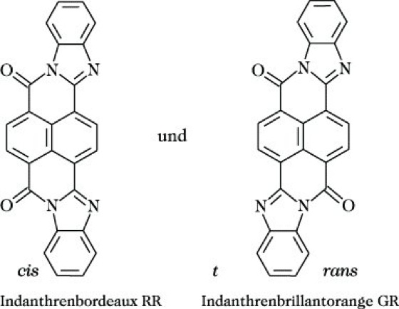 4) Spezielle C. Neben den unter 1) bis 3) genannten C. haben mehrere kleinere Gruppen von konjugierten Carbonylverbindungen als Farbstoffe technische Bedeutung, z. B. lineare Chinacridone (Abb. 3) und Anthronderivate, die als Pigmentfarbstoffe mit sehr guten Echtheitseigenschaften verwendet werden. C. der Perylentetracarbonsäurediimid-Reihe und der Naphthalintetracarbonsäurediimid-Reihe lassen sich durch Reaktion von Perylen-3,4,9,10-tetracarbonsäure bzw. Naphthalin-1,4,5,8-tetracarbonsäuredianhydrid mit den entsprechenden Aminen herstellen, z. B. Indanthrenbordeaux RR und Indanthrenbrillantorange GR (Abb. 4).