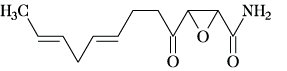 Cerulenin, das Amid einer ungesättigten Fettsäure mit antibiotischen Eigenschaften gegen Pilze, Hefen und grampositive Bakterien. C. wird von echten Pilzen (Fungi imperfecti), meist zusammen mit Helvolsäure (tetracyclisches Triterpen mit antibiotischer Wirkung gegen grampositive Bakterien), gebildet. C. hemmt die Fettsäurebiosynthese (Fettsäuresynthase) sowie die Sterinbiosynthese und verhindert die Synthese und Sekretion bestimmter extrazellulärer Proteine einiger Bakterien (z. B. Glucosyltransferase von Streptococcus-Arten).