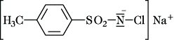 Chloramin T, Tosylchloramidnatrium, ein Desinfektionsmittel. Die desinfizierende Wirkung beruht auf der Bildung von Hypochlorit bzw. Chlor.