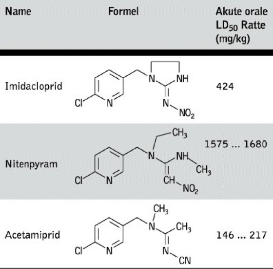 Chlornicotinylinsektizide. Neue Klasse von Insektiziden, die sich an den Acetylcholin-Rezeptoren der nachfolgenden Nervenfasern binden. Im Gegensatz zu den phosphororganischen Insektiziden und den Carbamatinsektiziden, die das Enzym Acetylcholinesterase hemmen, weist diese Wirkstoffgruppe einen neuen Wirkungsmechanismus auf. C. können durch die Acetylcholinesterase nicht abgebaut werden, eine nachhaltige Störung des Nervensystems ist die Folge, verbunden mit dem Tod des Schadinsektes. Die gute Kontaktwirkung und die hohe systemische Wirkung auch aus dem Wurzelbereich erlauben somit auch den Einsatz zur Boden- und Saatgutbehandlung mit einem Langzeitschutz. Bei der Anwendung als Beizmittel ist besonders die Wirkung gegen virusübertragende Schädlinge, wie Blattläuse, interessant (Beispiele s. Tab.).