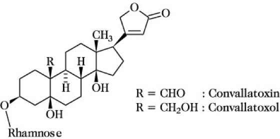 Convallariaglycoside, herzwirksame Glycoside, die sich zu 0,2 bis 0,6 % im getrockneten Kraut des Maiglöckchens Convallaria majalis finden. Es sind etwa 50 Glycoside isoliert worden, die bekanntesten sind Convallatoxin und Convallatoxol. In ihrer therapeutischen Wirkung entsprechen sie etwa den Strophanthusglycosiden.