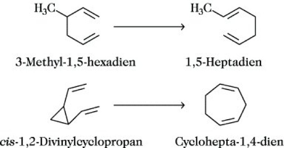 Cope-Umlagerung, eine [3,3]-sigmatrope Umlagerung, die zu den Valenzisomerisierungen gehört. Die Reaktion kann thermisch oder photochemisch ausgelöst werden; Edukte und Produkte sind stets konstitutionsisomer, im Fall von 1,5-Hexadien sind sie sogar identisch (entartete C.). Typische Beispiele sind die folgenden: