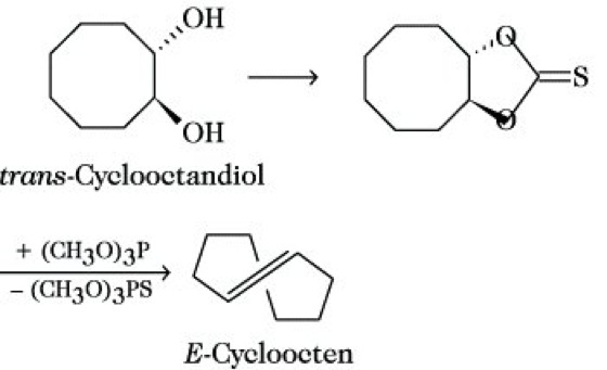 Corey-Winter-Reaktion, eine Eliminierung, bei der cyclische Thionocarbonate mit Trimethylphosphit in Olefine umgewandelt werden. Dabei entsteht zunächst ein Carben, das CO2 abspaltet. Die Reaktion verläuft stereoselektiv; so entstehen z. B. aus trans-Diolen (E)-Diastereomere.