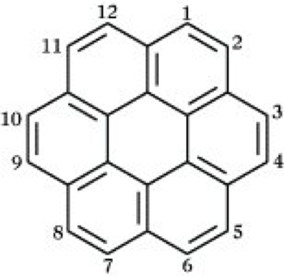 Coronen, ein kondensierter aromatischer Kohlenwasserstoff. C. bildet gelbe, blau fluoreszierende Kristallnadeln; F. 431 °C, Kp. 535 °C. C. ist unlöslich in Wasser, löslich in Benzol. Es kommt im Steinkohlenteer vor und wurde auch synthetisch hergestellt, hauptsächlich aus wissenschaftlichen Gründen.