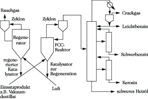 Das aus dem Reaktor austretende Öldampf-Katalysator-Gemisch wird in einem Zyklon getrennt, und der koksbeladene Katalysator wird durch einen Luftstrom in den Regenerator getragen, in dem der Koks abgebrannt wird. Die in den Abgasen enthaltene Wärme zieht man zur Dampferzeugung heran. Die Öldämpfe gelangen in eine Fraktionierkolonne, die sie in Benzin, Gasöl und Heizöl, Kreislauföl und Rückstand zerlegt. Als Katalysatoren für das FCC-Verfahren werden Alumosilicate oder modifizierte Zeolithe eingesetzt. Zur Entfernung von ungesättigten Verbindungen, insbesondere Diolefinen, müssen die erhaltenen Fraktionen noch einer Hydroraffination unterzogen werden. Als Crackreaktoren werden auch Flugstaub- oder Riser-Reaktoren eingesetzt. Dabei durchströmt der eingesetzte Kohlenwasserstoff zusammen mit dem heißen Katalysator ein Steigrohr (Riser), in welchem nach etwa 5 Sekunden Verweildauer die Crackreaktionen beendet sind.