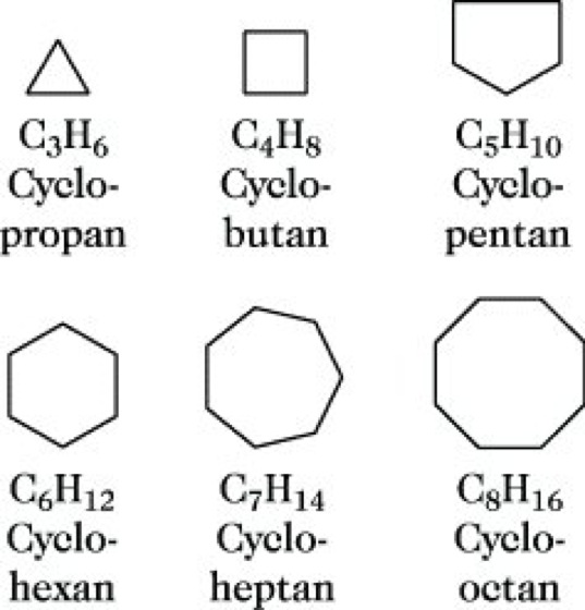 Die Bezeichnung erfolgt durch Kombination der Vorsilbe Cyclo- mit dem Namen des geradkettigen Alkans gleicher Anzahl von C-Atomen.