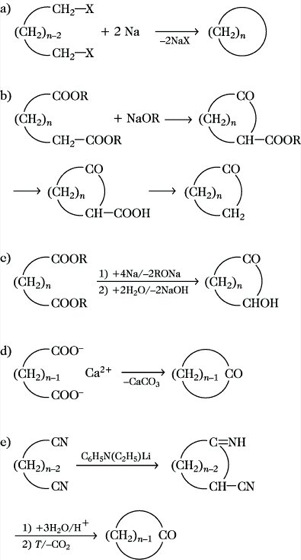 - Intramolekulare Thorpe-Reaktion (Abb. 2 e) von Dinitrilen zu Cycloketonen unter Anwendung des Verdünnungsprinzips für 5- bis 8- und 14- bis 33-gliedrige Ringe.