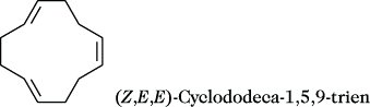 Cyclododecatrien, Cyclododeca-1,5,9-trien, ein ungesättigter Kohlenwasserstoff, von dem mehrere Konfigurationsisomere existieren. Die wichtigste Verbindung ist (Z,E,E)-Cyclododeca-1,5,9-trien, eine farblose Flüssigkeit; F. -18 °C, Kp. 237,5 °C bzw. 104 °C bei 1,33 kPa, nD20 1,5081. Dieses Isomere entsteht als Hauptprodukt bei der Cyclotrimerisation von Buta-1,3-dien in Gegenwart von Mischkatalysatoren nach Ziegler in guten Ausbeuten. Daneben kann auch (E,E,E)-Cyclododeca-1,5,9-trien, eine farblose, kristalline Verbindung (F. 34 bis 36 °C), erhalten werden. Diese technische Synthese von C. eröffnete den Zugang zu verschiedenen mittleren und großen Ringverbindungen. Durch selektive Hydrierung mit entsprechenden Katalysatoren kann man Cyclododecadien oder (Z)-Cyclododecen und daraus Cyclododecanol und Cyclododecanon gewinnen. Damit sind Laurinlactam und spezielle Polyamide zugänglich. Ebenso kann durch Oxidation Ringöffnung unter Bildung langkettiger Dicarbonsäuren erreicht werden.