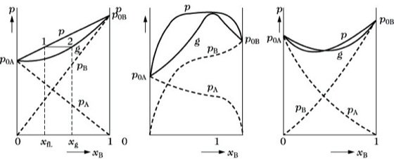 Der Gesamtdampfdruck p über der Mischung ist nach dem Daltonschen Gesetz gleich der Summe der Partialdrücke p = pA + pB. Im Idealfall gilt für beide Partialdrücke das Raoultsche Gesetz gemäß pA = p0AxA = p0A(1 – xB) und pB = p0BxB und damit p = p0A + (p0B – p0A)xB, wobei p0A und p0B die Dampfdrücke der reinen Komponenten bedeuten. Der Gesamtdampfdruck steigt oder fällt linear mit xB, je nachdem, ob pOB – pOA>< 0 zutrifft (Abb. a).