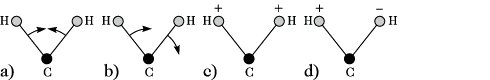 Deformationsschwingungen. Abb.: Bewegungsformen verschiedener Deformationsschwingungen: (a) Scherenschwingung, (b) Schaukelschwingung, (c) Nickschwingung, (d) Torsionsschwingung. Bewegung in der Zeichenebene, + und – Bewegung senkrecht dazu.