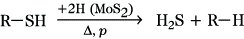 Desulfurierung, Abspaltung von Schwefel aus Thiolen unter Bildung von Schwefelwasserstoff und Kohlenwasserstoffen bei 300-400 °C, hohen Wasserstoffdrücken und Verwendung von Molybdän- oder Wolframsulfid-Katalysatoren:
