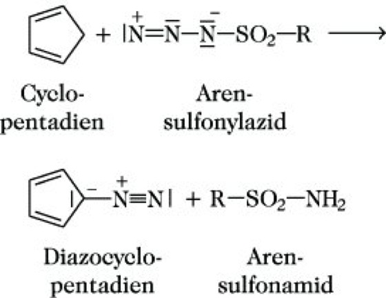 Diazogruppenübertragung, Verfahren zur Herstellung aliphatischer Diazoverbindungen durch Umsetzung von Arensulfonylaziden mit CH-aciden Reaktionspartnern, z. B. Cyclopentadien.