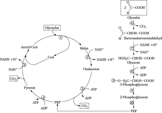Dicarbonsäurecyclus. Abb.: Abbau von Glyoxylat über den Dicarbonsäurecyclus mit Glyceratbahn als anaplerotischer Sequenz. Enzyme: (1) Malatsynthase, (2) Malatdehydrogenase, (3) PEP-Carboxykinase, (4) Pyruvatkinase, (5) Pyruvatdehydrogenase-Komplex, (6) Glyoxylatcarboligase (Glyoxylatdecarboxylase), (7) Glyceratdehydrogenase (Tartronsäuresemialdehydreductase), (8) Glyceratkinase, (9) Phosphoglyceratmutase, (10) Enolase.
