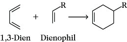 Diels-Alder-Reaktion, Diensynthese, eine von O. Diels und K. Alder 1928 erstmals beschriebene Methode der 1,4-Addition eines aktivierten Alkens oder Alkins an ein konjugiertes Dien unter Bildung eines sechsgliedrigen Ringsystems. Bei dieser in den meisten Fällen als synchrone (4 + 2)-Cycloaddition verlaufenden Reaktion werden 1,3-Diene und die aktivierten Alkene bzw. Alkine, die auch als Dienophile bezeichnet werden, unter Neubildung von zwei σ-Bindungen auf Kosten zweier π-Bindungen zusammengelagert. Wichtige Dienophile sind Maleinsäureanhydrid, Acrolein, Tetracyanoethylen, Acrylsäureester, p-Benzochinon, Acetylendicarbonsäureester und Azodicarbonsäureester. Als Dienkomponenten können aliphatische und alicyclische 1,3-Diene sowie verschiedene aromatische und heterocyclische Systeme eingesetzt werden, z. B. s-(Z)-Buta-1,3-dien, Cyclopenta-1,3-dien, Cyclohexa-1,3-dien, Anthracen und Furane. Außerdem können auch heteroanaloge 1,3-Diene bei der D. eingesetzt werden. Dabei handelt es sich um Verbindungen, in denen z. B. eine C=C-Doppelbindung durch eine C=O-, C=S- oder C=N-Gruppe ersetzt ist, z. B. α,β-ungesättigte Aldehyde und Ketone, α,β-ungesättigte Thioketone. Die D. verlaufen besonders leicht, wenn die Alkene bzw. Alkine durch Substituenten mit -I- oder -M-Effekt aktiviert sind und die Dienkomponenten +I- oder +M-Substituenten enthalten. Eine wichtige Voraussetzung für die D. ist außerdem die s-Z-Konformation des Diens. Die Spaltung der Diels-Alder-Addukte in die Ausgangskomponenten, die häufig bereits unter sehr milden Bedingungen beobachtet werden kann, wird als Retro-Diels-Alder-Reaktion bezeichnet; z. B. zerfällt das endo-Dicyclopentadien bei etwa 180 °C in Cyclopentadien. Die D. hat für die Konstitutionsaufklärung zahlreicher ungesättigter Naturstoffe sowie für die Synthesen einer Reihe von Insektiziden, z. B. Chlordan, Aldrin und Dieldrin, Bedeutung erlangt.
