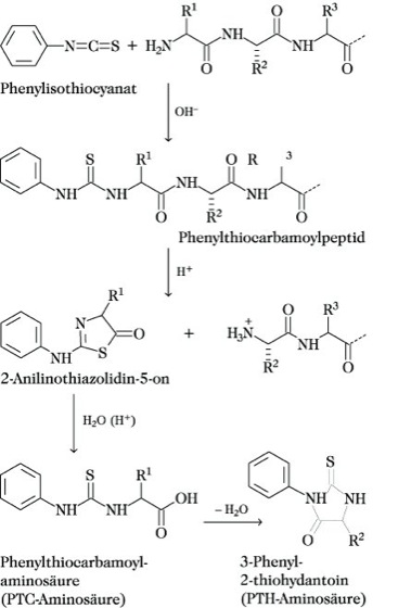 Edman-Abbau, das wichtigste chemische Sequenzierungsverfahren von Peptiden und kürzeren Polypeptiden durch stufenweise Markierung des N-terminalen Aminosäurerestes gefolgt von der Abspaltung vom verkürzten Peptid und Identifizierung des abgespaltenen Derivats (Abb.). Zu diesem Zweck wird das zu analysierende Peptid mit Phenylisocyanat umgesetzt. Das resultierende Phenylthiocarbamoylpeptid wird in saurer Lösung in das 2-Anilinothiazolin-5-on und das um eine Aminosäure verkürzte Peptid gespalten. Nachfolgende Hydrolyse führt zur Phenylthiocarbamoylsäure, die in das 3-Phenyl-2-thiohydantoin umgewandelt wird. Die Phenylthiohydantoin-Derivate (PTH-Aminosäuren) lassen sich chromatographisch identifizieren.