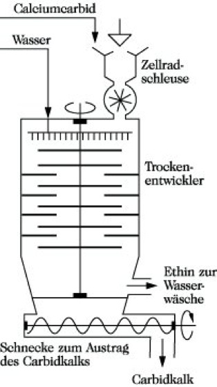 Herstellung. E. wird großtechnisch besonders nach zwei Verfahren hergestellt: 1) Zersetzung von Calciumcarbid mit Wasser: CaC2 + 2 H2O → C2H2 + Ca(OH)2. Diese Umsetzung des Calciumcarbids erfolgt bei Wasserüberschuß im Naßentwickler oder bei etwa stöchiometrischen Wassermengen im Trockenentwickler (Abb.), so daß ein rieselfähiges Kalkhydratpulver (Carbidkalk) anfällt. Der Carbidkalk wird im Bauwesen, in der chem. Industrie oder in der Landwirtschaft verarbeitet. Aus 1 kg Carbid erhält man je nach Reinheit 230 bis 300 l technisches E.