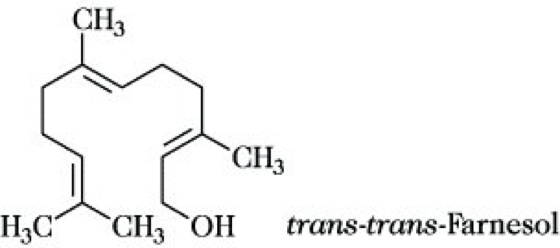 Farnesol, acyclischer Sesquiterpenalkohol, farblose Flüssigkeit mit blumigem Geruch. F. ist Bestandteil ätherischer Öle, z. B. des Lemongras-, Pomeranzenblüten-, Citronell- und Rosenöls. Das natürliche F. ist die 6-trans-Form. Das aus Larven des Mehlkäfers Tenebrio molitor isolierte F. zeigt Juvenilhormonaktivität. Einige Insektenpheromone sind F.-Derivate. F. wird in der Riechstoffindustrie verwendet.