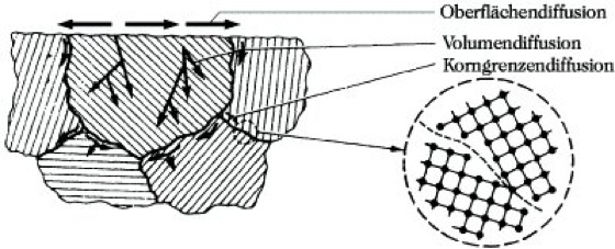 Die wichtigste Voraussetzung für den Ablauf von F. besteht im Stofftransport durch das Gitter zum Reaktionsort. Seine Phänomene und Mechanismen sowie seine strukturellen Voraussetzungen stehen deshalb im Mittelpunkt festkörperchemischer und -physikalischer Untersuchungen. Eine besondere Bedeutung für den Stofftransport in festen Phasen besitzen Diffusionsvorgänge. Sie laufen hier mit Geschwindigkeiten ab, die um viele Größenordnungen kleiner sind als in Flüssigkeiten oder Gasen. Man unterscheidet dabei zwischen verschiedenen Diffusionsarten (Abb.). Da im Innern eines Festkörpers ein direkter Platzwechsel von Gitterbausteinen hohe Aktivierungsenergien erfordert und daher sehr unwahrscheinlich ist, spielen für die Volumendiffusion Kristallbaufehler eine entscheidende Rolle. Vor allem Punktdefekte ermöglichen den Stofftransport über Leerstellen und Zwischengitterplätze, aber auch Versetzungen führen zu einer erhöhten Teilchenbeweglichkeit entlang der gestörten Gitterbereiche. Die Korngrenzendiffusion beruht auf der Lockerung des Gitterverbandes im Bereich von Korngrenzen. Bei einer Wanderung von Kristallbausteinen oder auch von adsorbierten Teilchen auf Festkörperoberflächen spricht man von Oberflächendiffusion. Die Diffusionskoeffizienten für die Volumen-, Korngrenzen- und Oberflächendiffusion nehmen in der genannten Reihenfolge beträchtlich zu, oft um einige Zehnerpotenzen. Praktisch hat man es meist mit einer Überlagerung der verschiedenen Diffusionsarten zu tun. Neben der Diffusion spielt für den Stofftransport bei F. der chem. Transport über die Gasphase eine wichtige Rolle (chemische Transportreaktionen).