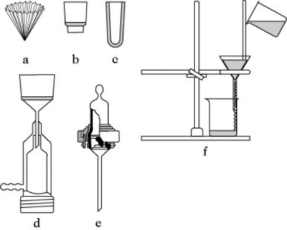 Filter. Abb. 1: Verschiedene Ausführungen: (a) Faltenfilter, (b) Filtertiegel, (c) Filterkerze, (d) Filtrationsglocke (Bakterienfilter), (e) Druckfilter nach Grabar (Membranfilter), (f) Filtriereinrichtung.