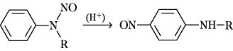 Fischer-Hepp-Umlagerung, intermolekulare Umlagerung von N-Nitroso-N-alkyl- oder N-Nitroso-N-arylanilinen zu N-alkylierten oder N-arylierten 4-Nitrosoanilinen in Gegenwart von Mineralsäuren: