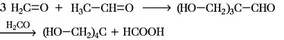 die Bildung von cyclischem Tetraoxymethylen wurde ebenfalls beobachtet. Durch Erhitzen oder durch Hydrolyse kann aus den genannten Polymeren F. zurückgewonnen werden. Da F. kein α-ständiges H-Atom enthält, unterliegt es in Gegenwart von Alkali- oder Erdalkalihydroxiden in höher konz. Lösungen der Cannizzaro-Reaktion unter Disproportionierung zu Methanol und Ameisensäure. Mit Ammoniak reagiert F. unter Bildung von Hexamethylentetramin (Urotropin). Verbindungen mit reaktiven H-Atomen reagieren mit F. unter Bildung von Hydroxymethylverbindungen. So wird z. B. aus F. und Acetaldehyd Tris(hydroxymethyl)acetaldehyd gebildet, der mit überschüssigem F. zum Pentaerythrit weiterreagiert: