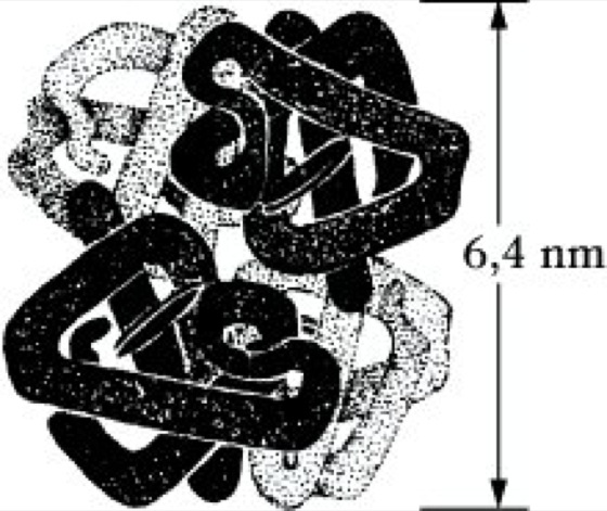 Hämoglobine. Abb.: Quartärstruktur des Hämoglobins. Schema der räumlichen Anordnung der α- und β-Ketten. Die schwarze Scheibe stellt die Hämgruppe dar.