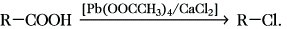 Halodecarboxylierung, synthetische Methode zur Umwandlung von Monocarbonsäuren in Halogenkohlenwasserstoffe. Eine Reaktionsmöglichkeit besteht in der Umsetzung einer Carbonsäure mit Blei(IV)-acetat und Calciumchlorid in siedendem Benzol: