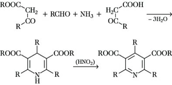 Hantzschsche Pyridinsynthese, Synthese substituierter Pyridine durch Kondensation von β-Ketocarbonsäureestern mit Aldehyden und Ammoniak. Durch Oxidation mit salpetriger Säure kann die primär gebildete Dihydroform in das entsprechende Pyridinderivat umgewandelt werden.