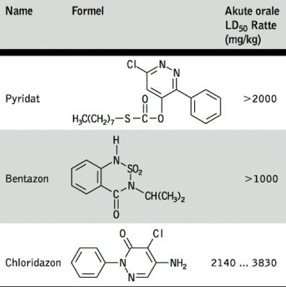 heterocyclische Herbizide. Sie gehören zu der großen Gruppe der Photosynthesehemmer. Die selektive Wirkung beruht neben einem unterschiedlichen Aufnahmeverhalten vor allem auf der Fähigkeit, den Wirkstoff bzw. die herbizidwirksamen Metaboliten durch Bildung von glycosidischen Konjugationen schnell zu inaktivieren (Beispiele s. Tab.).