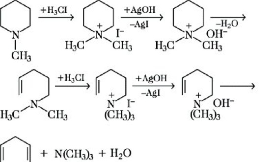 Die Abbaumethode nach Hofmann hat für die Konstitutionsaufklärung von Naturstoffen, in denen häufig ketten- oder ringförmige Stickstoffbasen als Strukturfragmente enthalten sind, große Bedeutung erlangt. Die zu untersuchende stickstoffhaltige Verbindung wird zunächst durch vollständige oder erschöpfende Methylierung mit Methyliodid in das entsprechende quartäre Ammoniumiodid umgewandelt. Durch anschließende Einwirkung von Silberhydroxid wird das Ammoniumhydroxid gebildet, das dann pyrolytisch gespalten wird. Ringförmige Stickstoffverbindungen werden meist in offenkettige Produkte zerlegt, z. B. entsteht aus N-Methylpiperidin (s. Abb.), Penta-1,4-dien, Trimethylamin und Wasser.