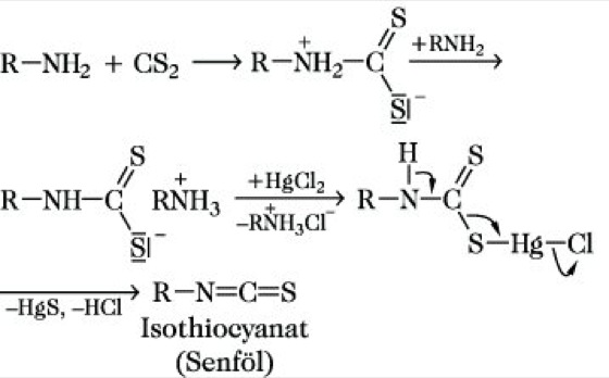 Hofmannsche Senfölreaktion, Herstellung von Isothiocyanaten (Senföle) durch Umsetzung von primären Aminen und Schwefelkohlenstoff mit Quecksilber(II)-chlorid in der Wärme: