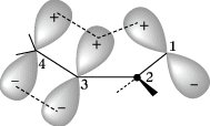 Durch Überlappung der pπ-Orbitale an den Zentren 1 und 7 (Abb. 1) resultiert ein cyclisch delokalisiertes π-System mit sechs Elektronen. Die Ausbildung einer solchen Struktur steht in Einklang mit 1H-NMR-spektroskopischen Befunden. Aufgrund des Ringstroms wird das endo-Proton (Hb) abgeschirmt, während das Signal des exo-Protons (Ha) bei niedrigerer Feldstärke erscheint. Die nichtklassische Elektronendelokalisation durch Überlappung von pπ-Orbitalen an C-Atomen, die nicht durch eine zusätzliche σ-Bindung verknüpft sind, wird als Homokonjugation bezeichnet. Auf diese Weise kann die Konjugation über sp3-Zentren hinweg aufrechterhalten werden. Wie die Wechselwirkung eines Carbenium-Ions mit einer β-olefinischen Gruppe zeigt, ist die homokonjugative Überlappung zwischen den C-Atomen 1 und 3 (Abb. 2) durch den Raum aus geometrischen Gründen auf einen Lappen oder p-Orbitale beschränkt. Das Konzept der H. läßt sich auch auf Anionen und neutrale Systeme anwenden.