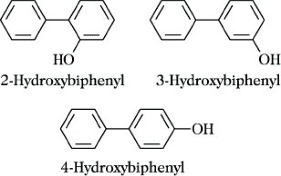 Hydroxybiphenyle, drei isomere phenylsubstituierte Phenole: 2-Hydroxybiphenyl, F. 58 bis 60 °C, Kp. 286 °C; 3-Hydroxybiphenyl, F. 78 °C, Kp. 300 °C; 4-Hydroxybiphenyl, F. 165 bis 167 °C, Kp. 305 bis 308 °C (Subl.). H. bilden farblose Kristalle, die in Wasser sehr schwer, in Alkalihydroxidlösung und den meisten organischen Lösungsmitteln leicht löslich sind. Sie kommen im Rohphenol vor, aus dem sie abgetrennt werden können. Synthetisch sind sie ebenfalls über die bekannten Darstellungsmethoden für Phenole zugänglich. Sie haben bakterizide und fungizide Wirkung und werden zur Herstellung von Desinfektionsmitteln und Konservierungsmitteln verwendet. Die Natriumsalze der H. werden teilweise als Färbebeschleuniger bei der Färbung von PVC-Fasern und Polyesterfasern eingesetzt.