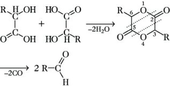 Hydroxycarbonsäuren, Carbonsäuren, bei denen ein oder mehrere Wasserstoffatome des Kohlenwasserstoffrestes durch eine oder mehrere Hydroxygruppen ersetzt sind. Der Bezeichnung der H. mit alkoholischer Hydroxygruppe liegt der Name der unsubstituierten Carbonsäure zugrunde, Stellung und Anzahl der Hydroxygruppen wird dem Namen der Carbonsäure vorangestellt. Diese Bezeichnungsweise ist auch in Verbindung mit dem Trivialnamen der Carbonsäure gebräuchlich, z. B. Milchsäure, 2-Hydroxypropionsäure bzw. α-Hydroxypropionsäure. H. sind normalerweise flüssig (Ausnahme: Glycolsäure fest) und gut wasserlöslich. Allg. Darstellungsmethoden sind die katalytische Hydrierung von Oxocarbonsäureestern und anschließende Hydrolyse, die saure Hydrolyse von Cyanhydrinen, die Hydrolyse von Halogencarbonsäuren, die Reformatski-Reaktion, die Oxidation von Hydroxyaldehyden und die Benzilsäureumlagerung. Bei der thermischen Behandlung der H. kommt es unter Dehydratisierung zu kooperativen Reaktionen von Hydroxy- und Carboxygruppe, deren Reaktionsprodukte von der gegenseitigen Stellung beider funktioneller Gruppen abhängen. α-H. bilden durch intermolekulare Dehydratisierung 3,6-Dialkyl-1,4-dioxan-2,5-dione (Lactide), die bei höherer Temperatur unter Decarbonylierung in Aldehyde zerfallen: