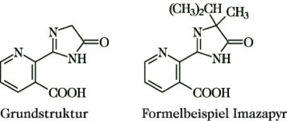 Imidazolinonherbizide. Gemeinsames Strukturmerkmal ist ein Imidazolinon- und ein Phenyl- oder Pyridinring mit einer Carboxygruppe in ortho-Stellung. Die Imidazolinone hemmen wie die Sulfonylharnstoffherbizide die Acetolactat-Synthase. Sie wirken über Blatt und Boden und liegen im Boden als Anionen vor, woraus eine hohe Bodenbeweglichkeit resultiert, verbunden mit langen Halbwertszeiten und möglichen Nachbauproblemen.