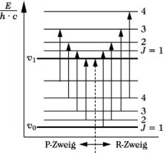 Die beiden ausgezogenen Linien stellen in einem Energiediagramm die beiden niedrigsten Schwingungsniveaus seines Moleküls dar. Zu jedem Schwingungszustand gehört eine Reihe von Rotationsniveaus, die als gestrichelte Linien mit den dazugehörigen Rotationsquantenzahlen J eingezeichnet sind. Bei einer Änderung der Schwingungsquantenzahl von v= 0 nach v = 1 erfolgt unter Berücksichtigung der Auswahlregel ΔJ = ±1 ein Übergang von einem Rotationsniveau des Schwingungsgrundzustandes zum nächsthöheren oder nächstniederen Rotationsniveau des ersten angeregten Schwingungszustandes, wie es durch einige Pfeile dargestellt ist. Man erhält so anstelle einer einzigen "Schwingungslinie" ein ganzes Liniensystem, das in zwei Teile zerfällt. Ein Teil, für den ΔJ = +1 ist, nennt man den R-Zweig, den anderen Teil, für den ΔJ = -1 ist, den P-Zweig. Im R-Zweig addiert sich die Energie des Rotationsüberganges zu der der Schwingung, im P-Zweig wird diese Rotationsenergie von der Schwingungsenergie subtrahiert. Zwischen beiden Zweigen fehlt die 0-0-Linie, die infolge der Auswahlregeln für die Änderung der Rotationsquantenzahl verboten ist. Die Intensitätsverteilung innerhalb beider Zweige entspricht wie bei den reinen Rotationsspektren der thermischen Verteilung der Moleküle auf die Rotationszustände. Die Lage der entsprechenden Absorption im Spektrum wird im wesentlichen durch die Energiedifferenz der Schwingungszustände, die Feinstruktur durch die Änderung der Rotationszustände bestimmt. Eine derartige Anhäufung von Absorptionslinien, die zu einem Schwingungsübergang, aber zu verschiedenen Rotationsübergängen gehören, nennt man eine Absorptionsbande (Abb. 7).