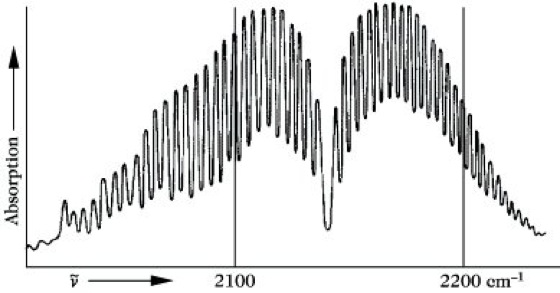 Infrarotspektroskopie. Abb. 7: Absorptionsbande im Rotationsschwingungsspektrum des Kohlenmonoxids.