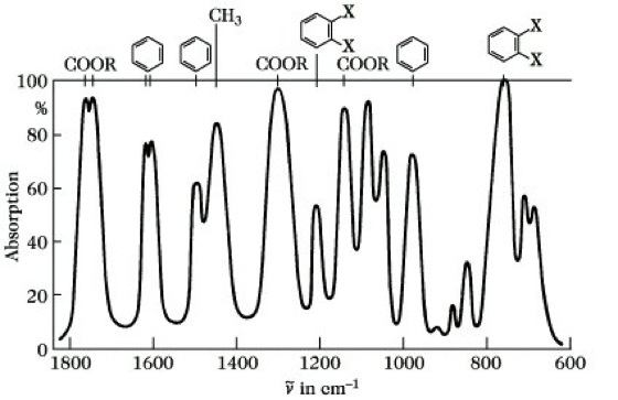 2) Identifizierung von Substanzen. Aus Tab. 3 folgt, daß ein IR-Spektrum unterhalb 1500 cm-1 relativ bandenreich und unübersichtlich ist. Hier erscheinen Gerüstschwingungen, zahlreiche Deformationsschwingungen, aber auch noch Valenzschwingungen schwerer Atome, z. B. der Kohlenstoff-Halogen-Bindung. Schwingungszuordnungen sind deshalb in diesem Gebiet erschwert. Die IR-Absorptionen sind jedoch für das Molekül als Ganzes sehr charakteristisch, so daß dieses Gebiet auch als Fingerabdruck- (fingerprint-) Gebiet bezeichnet wird, das sich hervorragend zur Feststellung der Identität einer Substanz mit einer authentischen Probe eignet. Der Identitätsnachweis zweier reiner Substanzen wird dadurch geführt, daß man die IR-Spektren beider Stoffe Bande für Bande auf ihre Identität überprüft. Im Gegensatz zu vielen anderen Stoffkonstanten, wie Siedepunkt, Schmelzpunkt, Dichte, Brechung, hat das IR-Spektrum den Vorteil, infolge der vielen in ihm enthaltenen Absorptionsbanden eine wesentlich größere Anzahl von Vergleichsmöglichkeiten zu bieten. Substanzen ähnlicher Struktur werden sich zwar auch in ihrem IR-Spektrum bis zu einem gewissen Grad ähneln, identische Spektren ergeben sie jedoch nicht.