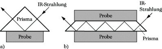 Infrarotspektroskopie. Abb. 10: Methoden der abgeschwächten Totalreflexion: (a) Einfachreflexion, (b) Mehrfachreflexion.
