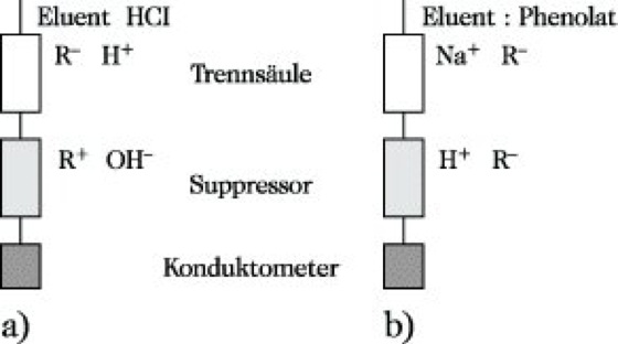 Man unterscheidet Kationen- und Anionenchromatographie (Abb. 1a und 1b). Daneben kennt man im Falle der Anionenchromatographie auch eine vereinfachte Form durch Verwendung von 10-3 bis 10-4 molaren Lösungen von Phthalsäure als Eluent im pH-Bereich von 4 bis 6. Aufgrund der geringen elektrischen Leitfähigkeit entfällt die Kombination mit einer Suppressorsäule.
