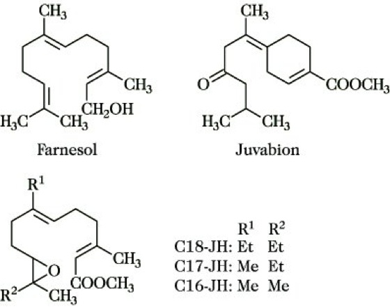 Bei den natürlichen J. handelt es sich um Sesquiterpene. Bereits das aus Larven des Mehlkäfers Tenebrio molitor isolierte Farnesol hat Juvenilhormonaktivität. Derivate des Farnesolsäuremethylesters mit Juvenilhormonaktivität konnten aus den Schmetterlingen Hyalophora cecropia (als Hauptkomponente C17-JH oder JH-I, daneben C18-JH oder JH-II) und Manduca sexta (C16-JH) isoliert werden. Zahlreiche aus Pflanzen isolierte oder synthetisch erhaltene Verbindungen weisen Juvenilhormonaktivität auf, z. B. das Sesquiterpen Juvabion. Untersuchungen über Struktur-Wirkungs-Beziehungen haben das Ziel, Insektizide mit hoher Selektivität zu entwickeln. Allerdings reagieren Insekten nur während einer relativ kurzen Entwicklungsphase auf exogene J. Larven und Imagines werden in Entwicklung und Aktivität nicht beeinträchtigt.