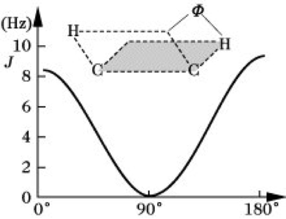 Karplus-Gleichung. Abb.: Graphische Darstellung der Karplus-Gleichung. J Kopplungskonstante, Φ Diederwinkel.