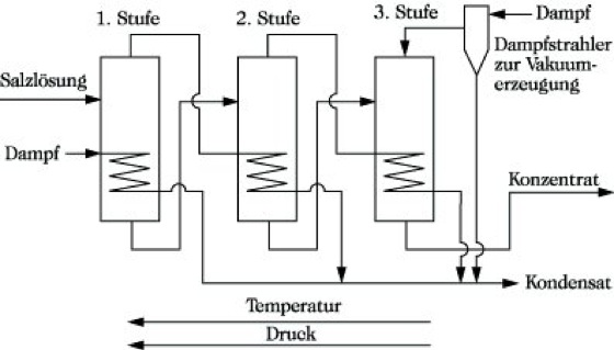 Kaskadenverdampfung. Abb.: Mehrkörperverdampferanlage.