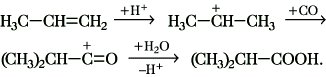 Koch-Reaktion, Methode zur stufenweisen Darstellung von Monocarbonsäuren durch Carbonylierung von Alkenen und anschließender Zersetzung des Zwischenproduktes mit Wasser: