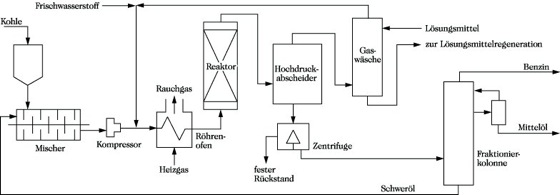 Infolge der schwankenden Erdölpreise gewinnt die K. wieder an Interesse (Carbochemie). Schwerpunkt der internationalen Entwicklungsarbeiten ist die Verbesserung des Bergius-Verfahrens durch Absenkung des hohen Druckes von 70 MPa auf Drücke unter 30 MPa bei gleichzeitiger Reduzierung des Wasserstoffverbrauches und Änderung der Rückstandsaufbereitung. In dem beim Bergius-Verfahren zum Anmaischen frischer Kohle eingesetzten Schleuderöl waren in großer Konzentration Asphaltene enthalten, die so immer wieder in den Hydrierreaktor gelangten und nur durch einen hohen Wasserstoffdruck abgebaut werden konnten. In neueren Verfahren wird der bei etwa 400 °C aus dem Heißabscheider abgezogene Hydrierschlamm im Vakuum destilliert, das asphaltfreie Vakuumdestillat zum Anmaischen der Kohle zurückgeführt und der asphalthaltige Rückstand einer Druckvergasung zur Wasserstofferzeugung zugeführt. Beim Synthoil-Verfahren (Abb.) wird eine Aufschlämmung von Kohle in Schweröl mit hoher Turbulenz bei 450 °C und einem Wasserstoffdruck von 12 MPa über einen festangeordneten Reaktor mit Cobalt-Molybdän-Trägerkatalysator geleitet. In einem Abscheider wird das Leichtbenzin abgetrennt und der Rückstand einer Zentrifuge zugeführt. Die Flüssigprodukte werden destilliert, der Filterkuchen wird im Kraftwerk verbrannt oder zur Synthesegaserzeugung eingesetzt. Das Schweröl der Destillation wird zum Anmaischen in den Prozeß zurückgeführt.